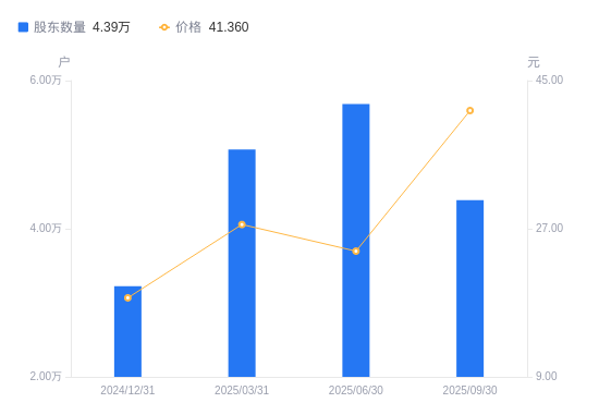 近一年(2024年9月30日至2025年9月30日),银轮股份A股股东户数从2.5万户,增加至4.39万户,增幅75.22%,区间股价上涨131.96%。