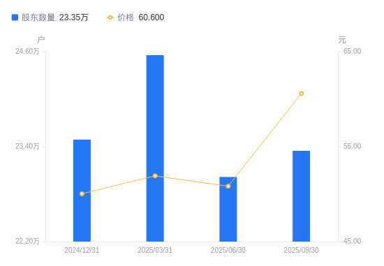 近一年(2024年9月30日至2025年9月30日),润和软件A股股东户数从19.02万户,增加至23.35万户,增幅22.73%,区间股价上涨94.61%。