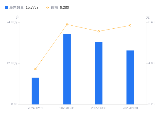 10月28日消息,数据显示,截至2025年9月30日,浙江东方A股股东总户数为15.77万户,较上期(2025年6月30日)减少2.41万户,降幅13.26%。公司最新A股总股本为34.15亿股,其中流通A股34.15亿股,户均持有流通A股数量为2.17万股,较上期增加2872.14股,增幅15.29%;户均持流通A股市值13.6万元,较上期增加2.24万元,增幅19.67%。