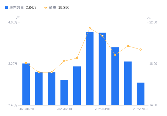 10月28日消息,数据显示,截至2025年9月30日,统一股份A股股东总户数为2.84万户,较上期(2025年6月30日)减少4088户,降幅12.59%。公司最新A股总股本为1.92亿股,其中流通A股1.48亿股,户均持有流通A股数量为5204.61股,较上期增加655.31股,增幅14.40%;户均持流通A股市值10.09万元,较上期增加1.11万元,增幅12.38%。