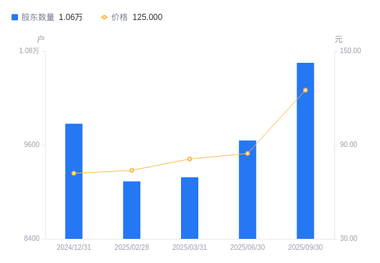 10月28日消息,数据显示,截至2025年9月30日,金海通A股股东总户数为1.06万户,较上期(2025年6月30日)增加993户,增幅10.28%。公司最新A股总股本为6000万股,其中流通A股4182.63万股,户均持有流通A股数量为3927.36股,较上期减少403.84股,降幅9.32%;户均持流通A股市值49.09万元,较上期增加12.47万元,增幅34.06%。