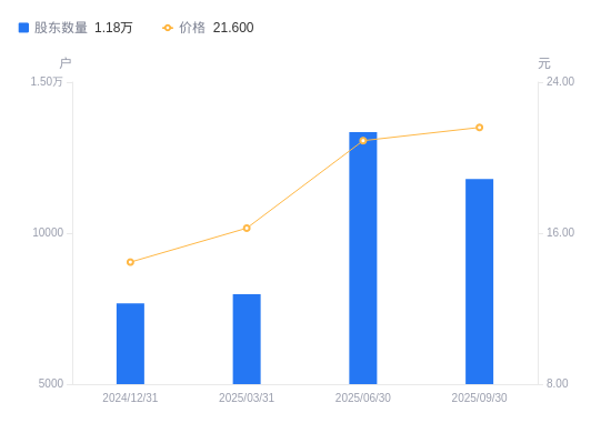 10月28日消息,数据显示,截至2025年9月30日,汇得科技A股股东总户数为1.18万户,较上期(2025年6月30日)减少1552户,降幅11.63%。公司最新A股总股本为1.42亿股,其中流通A股1.39亿股,户均持有流通A股数量为1.18万股,较上期增加1367.92股,增幅13.16%;户均持流通A股市值25.4万元,较上期增加3.68万元,增幅16.95%。