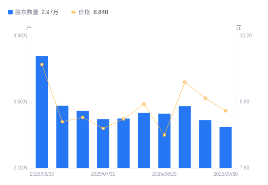 10月28日消息,数据显示,截至2025年9月30日,普路通A股股东总户数为2.97万户,较上期(2025年9月19日)减少1422户,降幅4.56%。公司最新A股总股本为3.73亿股,其中流通A股3.73亿股,户均持有流通A股数量为1.25万股,较上期增加572.57股,增幅4.78%;户均持流通A股市值11.09万元,较上期增加2307.84元,增幅2.13%。