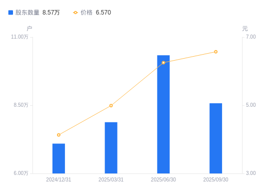10月28日消息,数据显示,截至2025年9月30日,科力远A股股东总户数为8.57万户,较上期(2025年6月30日)减少1.76万户,降幅17.04%。公司最新A股总股本为16.66亿股,其中流通A股16.66亿股,户均持有流通A股数量为1.94万股,较上期增加3310.41股,增幅20.54%;户均持流通A股市值12.76万元,较上期增加2.69万元,增幅26.71%。