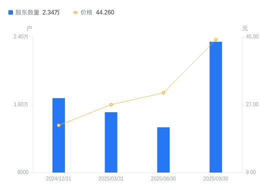 10月28日消息,数据显示,截至2025年9月30日,科创新源A股股东总户数为2.34万户,较上期(2025年6月30日)增加1.01万户,增幅75.52%。公司最新A股总股本为1.26亿股,其中流通A股1.2亿股,户均持有流通A股数量为5131.48股,较上期减少3875.43股,降幅43.03%;户均持流通A股市值22.71万元,较上期减少4.46万元,降幅16.42%。