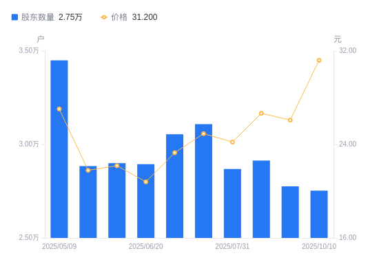 近一年(2024年9月30日至2025年9月30日),美力科技A股股东户数从1.53万户,增加至2.65万户,增幅73.17%,区间股价上涨196.21%。