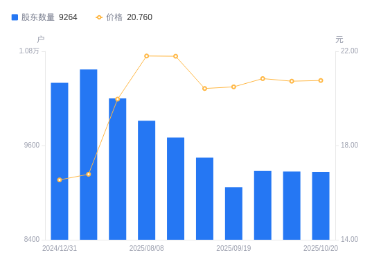 10月28日消息,数据显示,截至2025年9月30日,农心科技A股股东总户数为9275户,较上期(2025年9月19日)增加206户,增幅2.27%。公司最新A股总股本为1亿股,其中流通A股4990.5万股,户均持有流通A股数量为5380.59股,较上期减少122.22股,降幅2.22%;户均持流通A股市值11.21万元,较上期减少621.06元,降幅0.55%。