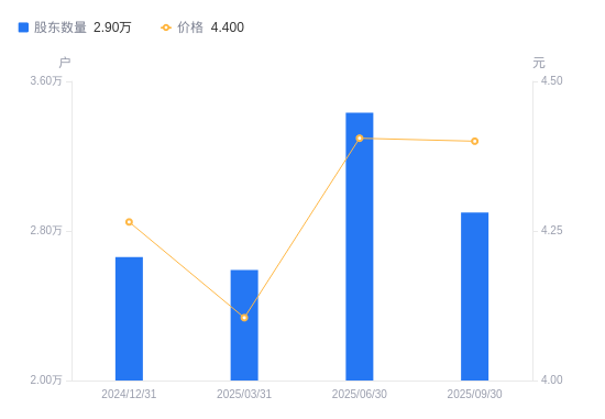 10月28日消息,数据显示,截至2025年9月30日,瑞茂通A股股东总户数为2.9万户,较上期(2025年6月30日)减少5337户,降幅15.55%。公司最新A股总股本为10.87亿股,其中流通A股10.87亿股,户均持有流通A股数量为3.75万股,较上期增加5826.91股,增幅18.41%;户均持流通A股市值16.49万元,较上期增加2.55万元,增幅18.27%。