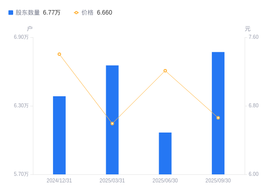 近一年(2024年9月30日至2025年9月30日),兴蓉环境A股股东户数从7.12万户,减低至6.77万户,降幅4.88%,区间股价上涨2.26%。