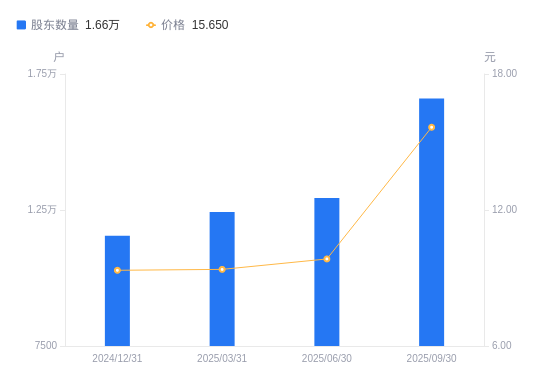 10月28日消息,数据显示,截至2025年9月30日,兴业科技A股股东总户数为1.66万户,较上期(2025年6月30日)增加3658户,增幅28.28%。公司最新A股总股本为2.96亿股,其中流通A股2.93亿股,户均持有流通A股数量为1.76万股,较上期减少4984.86股,降幅22.04%;户均持流通A股市值27.59万元,较上期增加5.34万元,增幅23.99%。