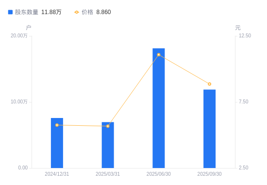 近一年(2024年9月30日至2025年9月30日),海联金汇A股股东户数从7.52万户,增加至11.88万户,增幅57.95%,区间股价上涨57.09%。