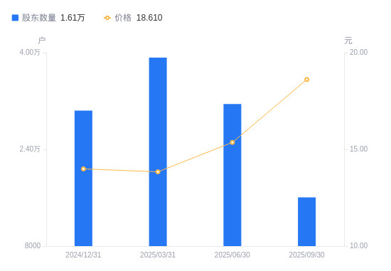 近一年(2024年9月30日至2025年9月30日),瀛通通讯A股股东户数从2.44万户,减低至1.61万户,降幅34.09%,区间股价上涨52.04%。