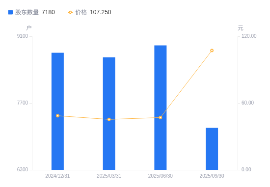 近一年(2024年9月30日至2025年9月30日),赛微微电A股股东户数从8947户,减低至7180户,降幅19.75%,区间股价上涨224.18%。