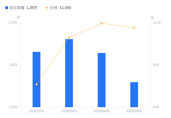 近一年(2024年9月30日至2025年9月30日),仁信新材A股股东户数从1.73万户,减低至1.35万户,降幅21.86%,区间股价上涨24.76%。