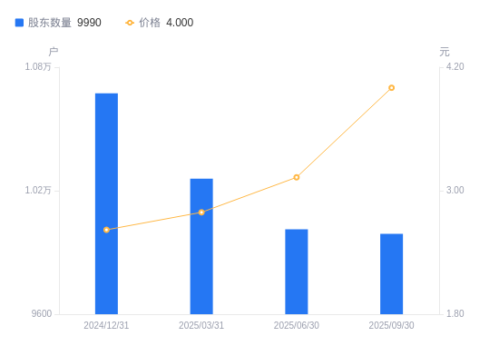 近一年(2024年9月30日至2025年9月30日),*ST围海A股股东户数从1.16万户,减低至9990户,降幅13.58%,区间股价上涨124.72%。