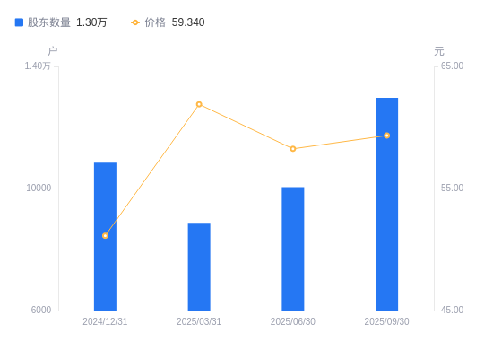 近一年(2024年9月30日至2025年9月30日),振华风光A股股东户数从9940户,增加至1.3万户,增幅30.46%,区间股价上涨17.05%。