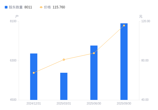 近一年(2024年9月30日至2025年9月30日),奕瑞科技A股股东户数从5294户,增加至8011户,增幅51.32%,区间股价上涨45.95%。