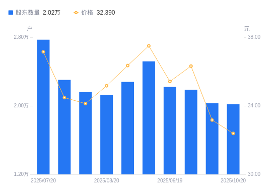 10月28日消息,数据显示,截至2025年10月20日,领湃科技A股股东总户数为2.02万户,较上期(2025年10月10日)减少110户,降幅0.54%。公司最新A股总股本为1.72亿股,其中流通A股1.58亿股,户均持有流通A股数量为7838.69股,较上期增加42.46股,增幅0.54%;户均持流通A股市值25.39万元,较上期减少4705.68元,降幅1.82%。