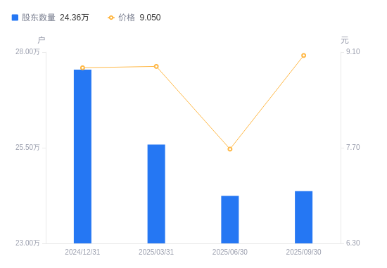 近一年(2024年9月30日至2025年9月30日),TCL中环A股股东户数从26.62万户,减低至24.36万户,降幅8.49%,区间股价下跌3.93%。