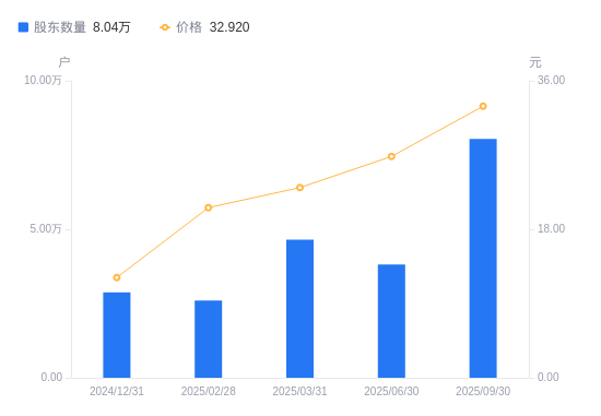 近一年(2024年9月30日至2025年9月30日),潍柴重机A股股东户数从2.35万户,增加至8.04万户,增幅242.38%,区间股价上涨396.08%。