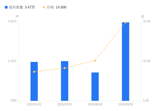近一年(2024年9月30日至2025年9月30日),华光环能A股股东户数从2.14万户,增加至3.47万户,增幅62.65%,区间股价上涨70.68%。
