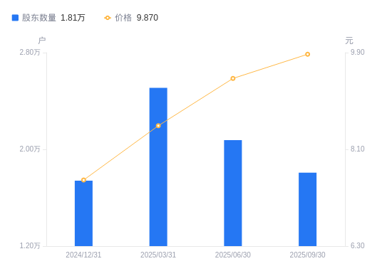 近一年(2024年9月30日至2025年9月30日),庄园牧场A股股东户数从1.85万户,减低至1.81万户,降幅2.42%,区间股价上涨37.08%。