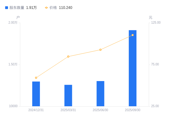 近一年(2024年9月30日至2025年9月30日),艾力斯A股股东户数从1.36万户,增加至1.91万户,增幅40.97%,区间股价上涨128.71%。