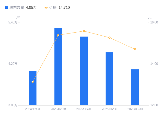 近一年(2024年9月30日至2025年9月30日),华金资本A股股东户数从4.3万户,减低至4.05万户,降幅6.02%,区间股价上涨14.12%。