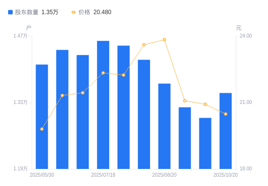 近一年(2024年11月20日至2025年10月20日),华是科技A股股东户数从1.63万户,减低至1.35万户,降幅17.18%,区间股价下跌13.71%。