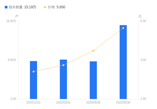 近一年(2024年9月30日至2025年9月30日),天府文旅A股股东户数从5.82万户,增加至15.19万户,增幅160.96%,区间股价上涨117.31%。