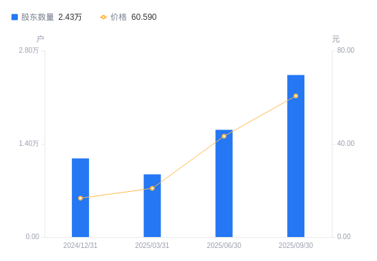 10月28日消息,数据显示,截至2025年9月30日,中旗新材A股股东总户数为2.43万户,较上期(2025年6月30日)增加8228户,增幅51.04%。公司最新A股总股本为1.88亿股,其中流通A股1.61亿股,户均持有流通A股数量为6598.88股,较上期减少3092.33股,降幅31.91%;户均持流通A股市值39.98万元,较上期减少1.96万元,降幅4.68%。