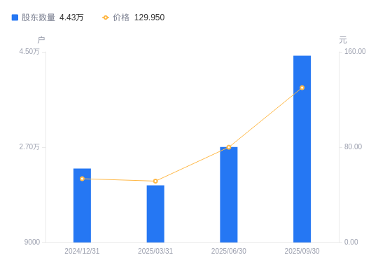 近一年(2024年9月30日至2025年9月30日),波长光电A股股东户数从2.55万户,增加至4.43万户,增幅73.54%,区间股价上涨214.57%。