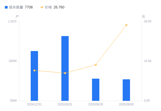 近一年(2024年9月30日至2025年9月30日),*ST威尔A股股东户数从1.03万户,减低至7708户,降幅25.51%,区间股价上涨192.14%。