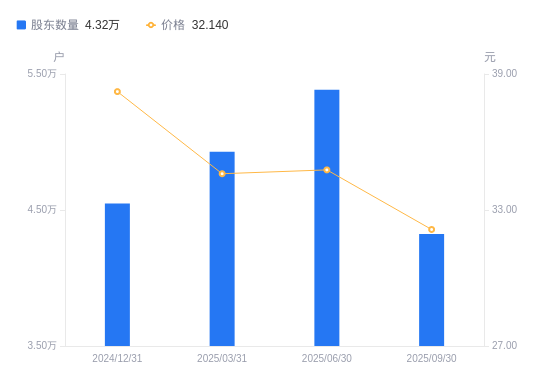近一年(2024年9月30日至2025年9月30日),博士眼镜A股股东户数从2.19万户,增加至4.32万户,增幅97.24%,区间股价上涨70.26%。