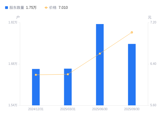 近一年(2024年9月30日至2025年9月30日),汇洁股份A股股东户数从1.66万户,增加至1.75万户,增幅5.60%,区间股价上涨15.87%。