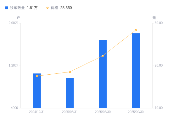10月29日消息,数据显示,截至2025年9月30日,立方制药A股股东总户数为1.81万户,较上期(2025年6月30日)增加1236户,增幅7.33%。公司最新A股总股本为1.9亿股,其中流通A股1.38亿股,户均持有流通A股数量为7606.99股,较上期减少557.37股,降幅6.83%;户均持流通A股市值21.57万元,较上期增加3.34万元,增幅18.34%。