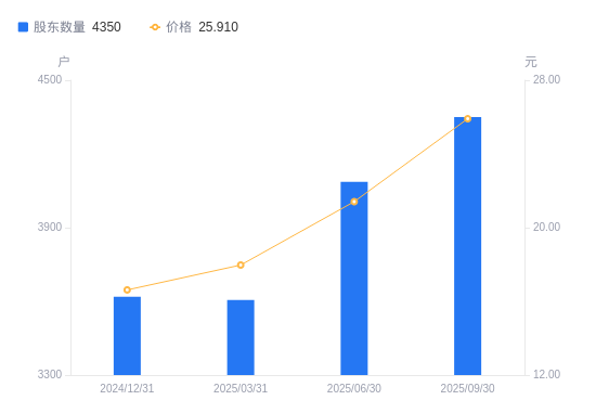 近一年(2024年9月30日至2025年9月30日),爱威科技A股股东户数从3686户,增加至4350户,增幅18.01%,区间股价上涨79.31%。