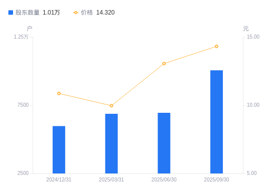 近一年(2024年9月30日至2025年9月30日),中源家居A股股东户数从6512户,增加至1.01万户,增幅54.58%,区间股价上涨57.02%。