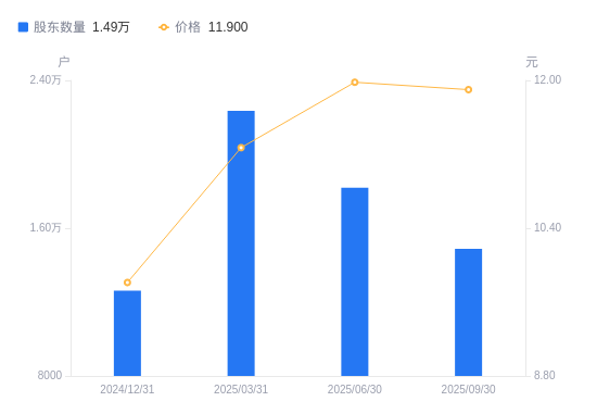 近一年(2024年9月30日至2025年9月30日),宁水集团A股股东户数从1.38万户,增加至1.49万户,增幅7.75%,区间股价上涨22.40%。