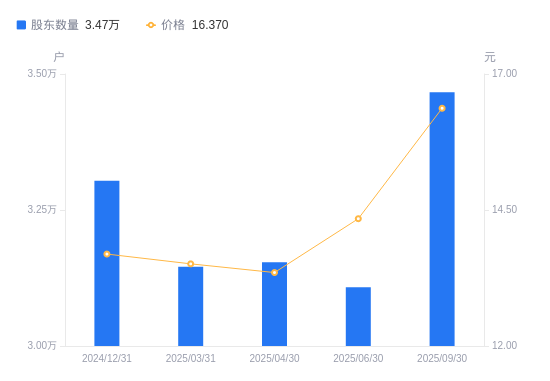 10月29日消息,数据显示,截至2025年9月30日,康泰医学A股股东总户数为3.47万户,较上期(2025年6月30日)增加3587户,增幅11.54%。公司最新A股总股本为4.02亿股,其中流通A股2.53亿股,户均持有流通A股数量为7308.85股,较上期减少843.57股,降幅10.35%;户均持流通A股市值11.96万元,较上期增加2740.1元,增幅2.34%。