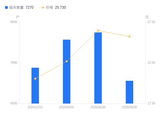 近一年(2024年9月30日至2025年9月30日),联盛化学A股股东户数从7965户,减低至7270户,降幅8.73%,区间股价上涨35.07%。
