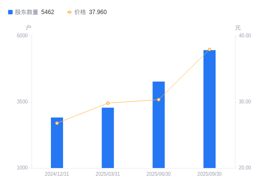 近一年(2024年9月30日至2025年9月30日),呈和科技A股股东户数从2707户,增加至5462户,增幅101.77%,区间股价上涨56.44%。
