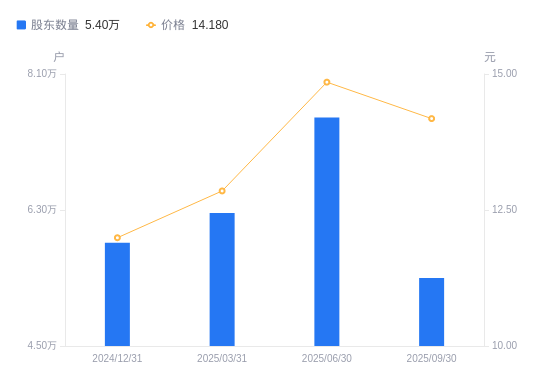 近一年(2024年9月30日至2025年9月30日),强力新材A股股东户数从5.48万户,减低至5.4万户,降幅1.46%,区间股价上涨33.52%。