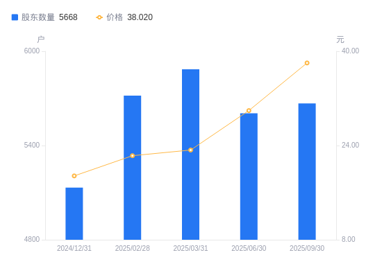 近一年(2024年9月30日至2025年9月30日),兰剑智能A股股东户数从4964户,增加至5668户,增幅14.18%,区间股价上涨132.97%。