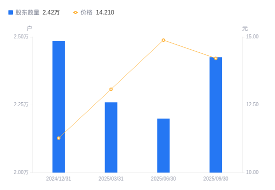 近一年(2024年9月30日至2025年9月30日),军信股份A股股东户数从2.69万户,减低至2.42万户,降幅9.74%,区间股价上涨39.71%。