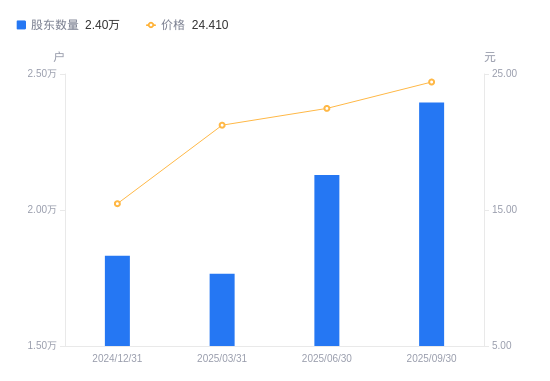 10月29日消息,数据显示,截至2025年9月30日,百傲化学A股股东总户数为2.4万户,较上期(2025年6月30日)增加2664户,增幅12.51%。公司最新A股总股本为7.06亿股,其中流通A股7.06亿股,户均持有流通A股数量为2.95万股,较上期减少3689.45股,降幅11.12%;户均持流通A股市值71.97万元,较上期减少2.57万元,降幅3.45%。