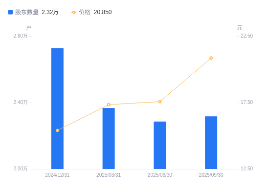 10月29日消息,数据显示,截至2025年9月30日,航天工程A股股东总户数为2.32万户,较上期(2025年6月30日)增加315户,增幅1.38%。公司最新A股总股本为5.36亿股,其中流通A股5.36亿股,户均持有流通A股数量为2.31万股,较上期减少318.91股,降幅1.36%;户均持流通A股市值48.24万元,较上期增加7.04万元,增幅17.09%。
