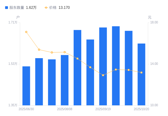 近一年(2024年9月30日至2025年9月30日),武汉天源A股股东户数从2.05万户,减低至1.69万户,降幅17.32%,区间股价上涨59.48%。