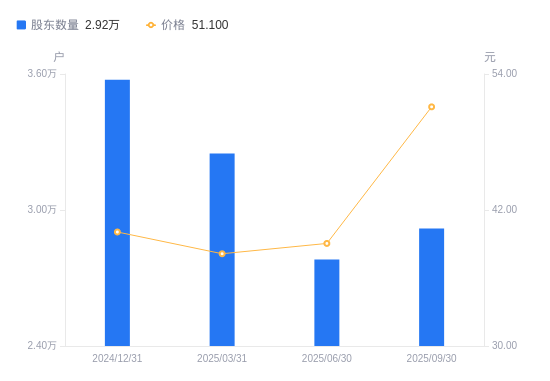 近一年(2024年9月30日至2025年9月30日),精研科技A股股东户数从3.6万户,减低至2.92万户,降幅18.88%,区间股价上涨55.04%。