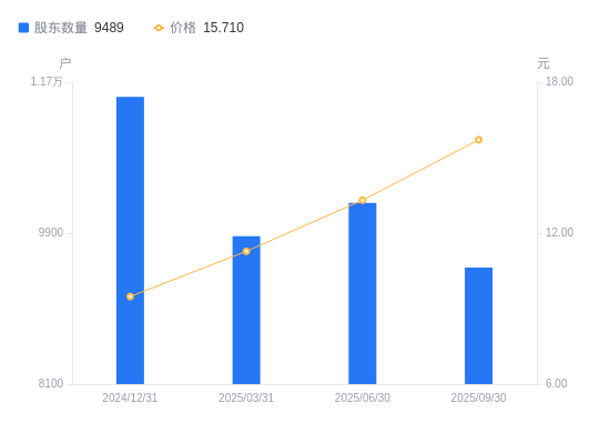 近一年(2024年9月30日至2025年9月30日),百川畅银A股股东户数从1.24万户,减低至9489户,降幅23.71%,区间股价上涨68.56%。